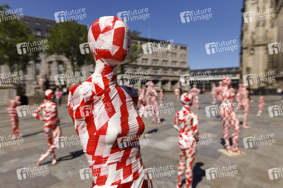 Kunst-Installation 'It is like it is - Mahnmal zur Coronakrise - 2020', einer Installation aus 111 maskierten Schaufensterpuppen, von Dennis Josef Meseg anlässlich der strengen Maßnahmen der Bundesregierung wegen der Coronakrise auf der Domplatte. Köln, 05.05.2020