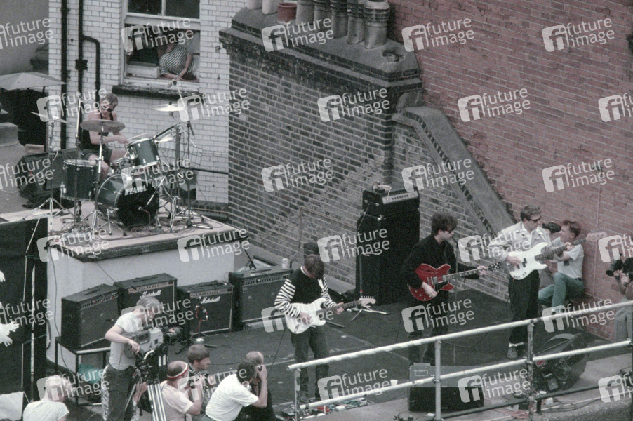 Pete de Freitas, Will Sergeant, Ian McCulloch und Les Pattinson von Echo & the Bunnymen live bei einem Rooftop-Konzert zum 20 jährigen Jubiläum des Beatles-Albums 'Sgt. Pepper’s Lonely Hearts Club Band' auf dem Dach vom HMV Record Store in der Oxford Street. London, 06.07.1987