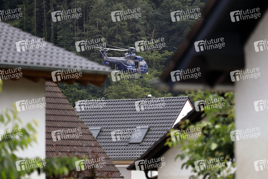 In der Eifel haben heftige Regenfälle und Dauerregen für Überschwemmungen und Überflutungen gesorgt. Im Ahrtal trat der Fluss vielerorts über die Ufer und überschwemmte nicht nur Keller sondern ganze Ortschaften. Im Bild Rettungshelikopter über dem Ort Dernau (Landkreis Ahrweiler), der beinahe komplett von den Wassermassen geflutet wurde. Viele Menschen verloren alles. Dernau, 15.07.2021