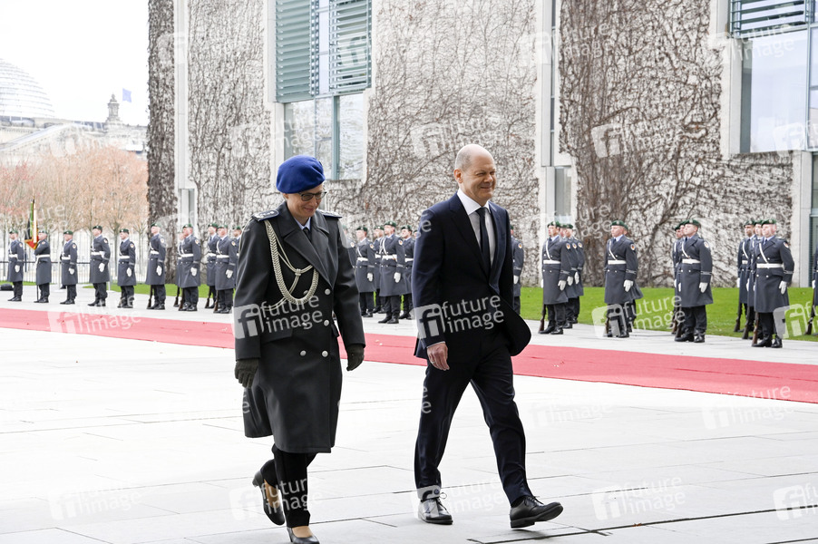 Olaf Scholz beim Empfang des Bundeskanzlers der Republik Österreich mit militärischen Ehren im Bundeskanzleramt. Berlin, 31.03.2022