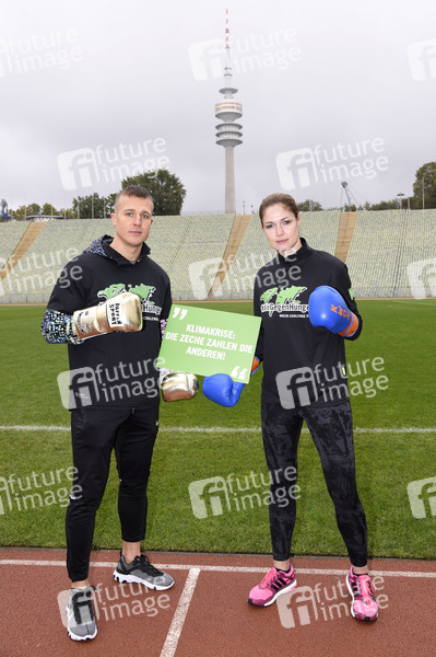 Alem Begic und Marie Lang beim Fototermin zur sportichen '#WocheChallenge' im Olympiastation München. Unter dem Motto 'Wir können was bewegen!' ruft die Welthungerhilfe zu dieser Challenge auf und bittet um Spenden für eine Welt ohne Hunger. München, 13.10.2020
