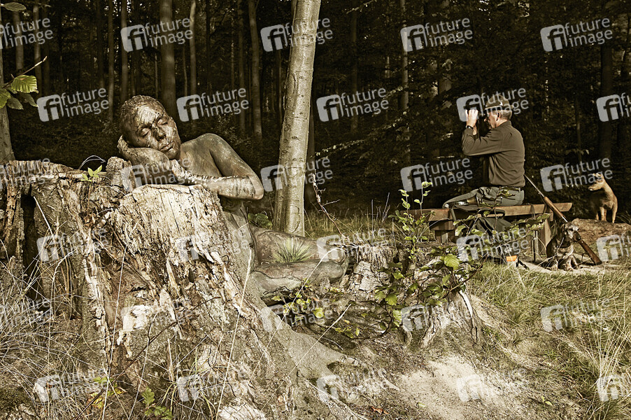 Bodypainting, Body-Painting, Erotik, Frau, Mädchen, nackt, Akt, weiblich, Körperkunst, Körperfarben, Farbe, Bemalung, Kunst, Malerei, Wald, Jäger, Reh, Hund, Dackel, Jagd, Natur, Baumwurzel, Baumstumpf, draußen, body painting, erotic, woman, girl, nude, female, body art, colors, forest, hunter, deer, dog, dachshund, hunting, nature, tree root, stump, outside, Joerg Duesterwald