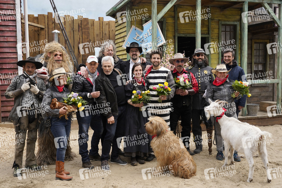 Rene Schobeß, Friedhelm Schatz, Malte Schatz und Gojko Mitic mit Stuntcrew bei der Premiere der Westernshow 'Tierisch verdreht' beim Saisonstart im Filmpark Babelsberg. Potsdam, 13.04.2019