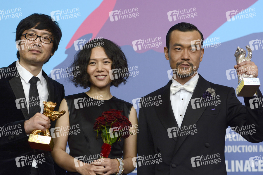 Diao Yinan mit dem Goldenen Bären für den besten Film 'Bai ri yan huo / Black Coal, Thin Ice', Vivian Qu und Liao Fan mit dem Silbernen Bären für den besten Darsteller in 'Bai ri yan huo / Black Coal, Thin Ice' bei der Pressekonferenz mit den Preisträgern auf der Berlinale 2014 / 64. Internationale Filmfestspiele Berlin, 15.02.2014