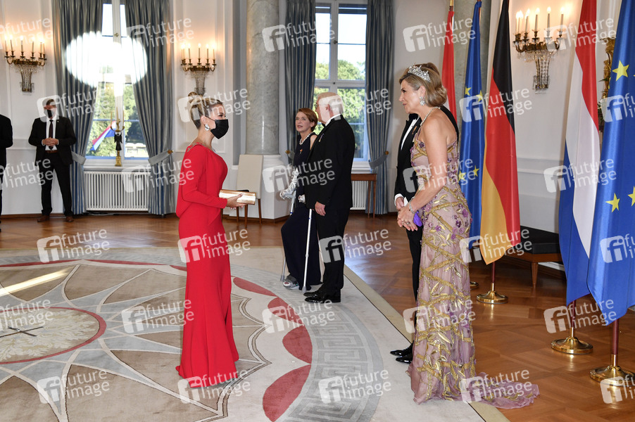 Sylvie Meis, Elke Büdenbender, Frank-Walter Steinmeier, König Willem-Alexander und Königin Maxima der Niederlande beim Defilee zum Staatsbankett zu Ehren von König Willem-Alexander der Niederlande und Königin Maxima, gegeben vom Bundespräsidenten und Elke Büdenbender im Schloss Bellevue. Berlin, 05.07.2021