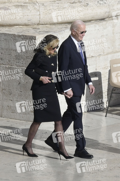 Joe Biden mit Ehefrau Jill Biden bei der Trauermesse für den verstorbenen Papst Franziskus auf dem Petersplatz. Vatikanstadt, 26.04.2025