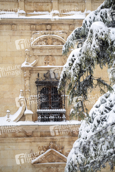 Plaza de Cervantes - Die Region Madrid nach dem Sturmtief Filomena, das in weiten Teilen Spaniens mit starken Schneefällen für Chaos sorgte. Starker Schneefall legte das öffentliche Leben nahezu lahm. Seit 50 Jahren hatte es nicht so geschneit. Alcalá de Henares, 10.01.2021