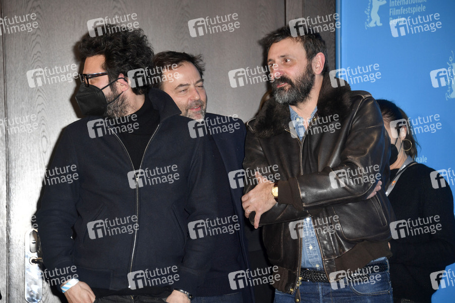Thomas Verhaeghe, Mathieu Verhaeghe und Quentin Dupieux beim Photocall zum Kinofilm 'Incroyable mais vrai / Incredible But True' auf der Berlinale 2022 / 72. Internationale Filmfestspiele Berlin im Hotel Grand Hyatt. Berlin, 11.02.2022