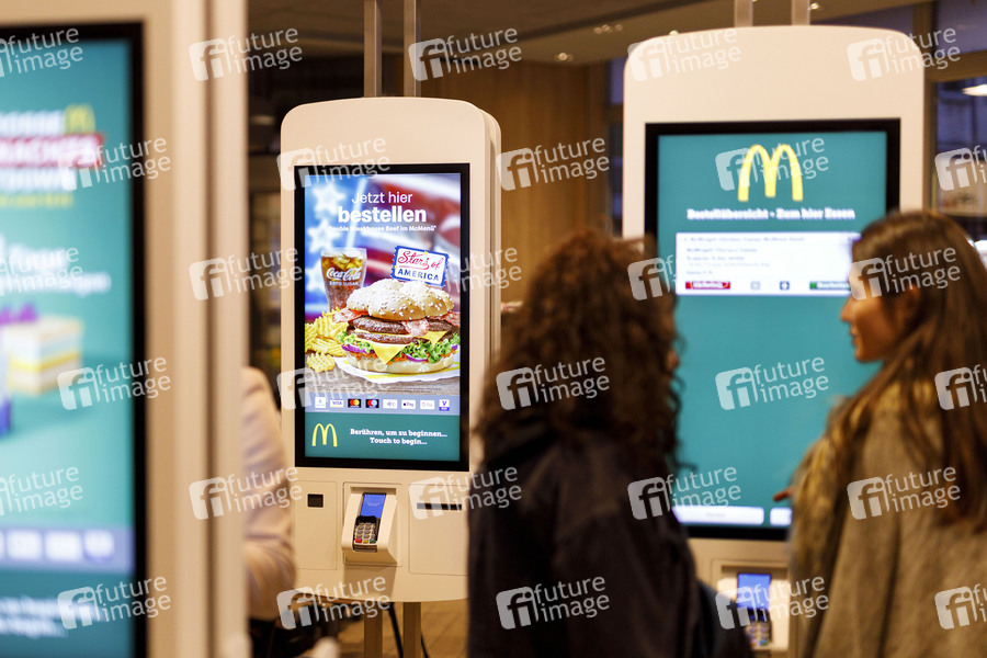 Bestellen, Automatisierung, Rationalisierung, Bestellprozess, Wartezeit, Tischservice, Personalkosten, Bestellsäule, Bestellsäulen, Bestellautomat, Bestellautomaten, McDonald's, McDonald, McDonalds, Burger, Fast Food, Fastfood, Restaurant, DriveIn, Drive In, Drive-in, Drive-thru, Schnellrestaurant, Ernährung, Fritten, Softdrinks, Cola, Menü, Sparmenü, Whopper, BigMäc, Big Mäc, Cheeseburger, Hamburger, Ketchup, Majo, McCafe, Burger-Kette, Schnellrestaurantkette, Systemgastronomie, Franchising, Konkurrenz, Filiale, Logo, Mahlzeit, Kalorien, Fett, gesunde Ernährung, Ernährungspyramide, Fast-Food-Kette, Säulenbestellung, Anstehzeit, Touchscreen, Prozessoptimierung, Symbolbild, Symbolfoto