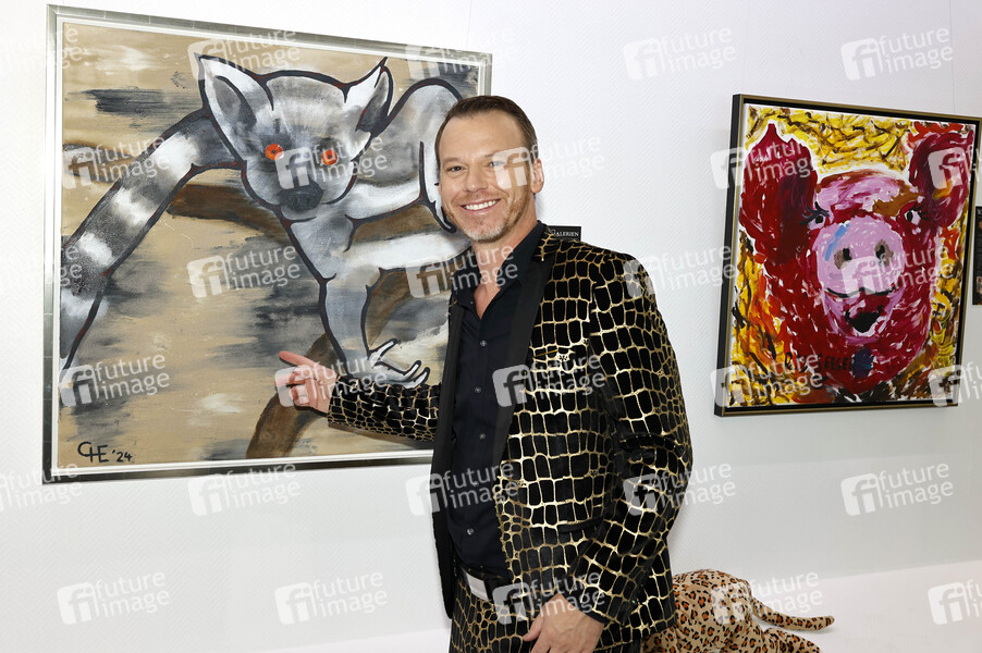 Christian Ehrlich mit seinem Bild beim Start der zweiten Kunst-Aktion 'Art'n'Schutz' zugunsten des Tier- und Artenschutzes mit einer Vernissage mit Bildern bedrohter Tiere gemalt von Promis in der Galerie Walentowski. Werl, 23.11.2024