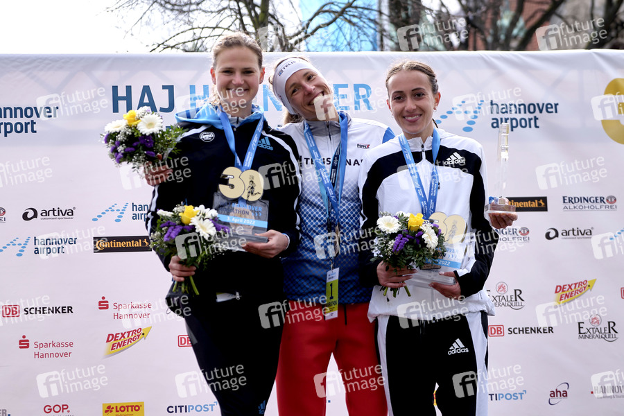 Rabea Schöneborn (Deutschland), Domenika Mayer (Deutschland) und Matea Parlow Kostro (Kroatien) beim 30. HAJ Marathon. Hannover, 03.04.2022
