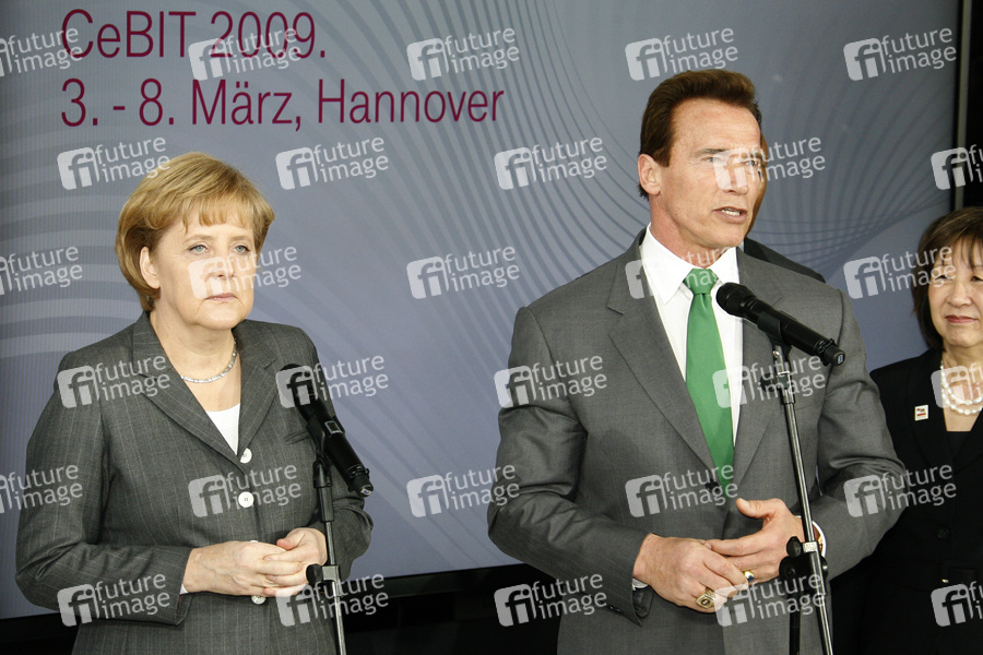 Eröffnungsrundgang von Bundeskanzlerin Merkel und Gouverneur Schwarzenegger auf der CeBIT 2009 (Centrum der Büro- und Informationstechnik), der weltgrößten Messe für Informations- und Computertechnik auf dem Messegelände in Hannover