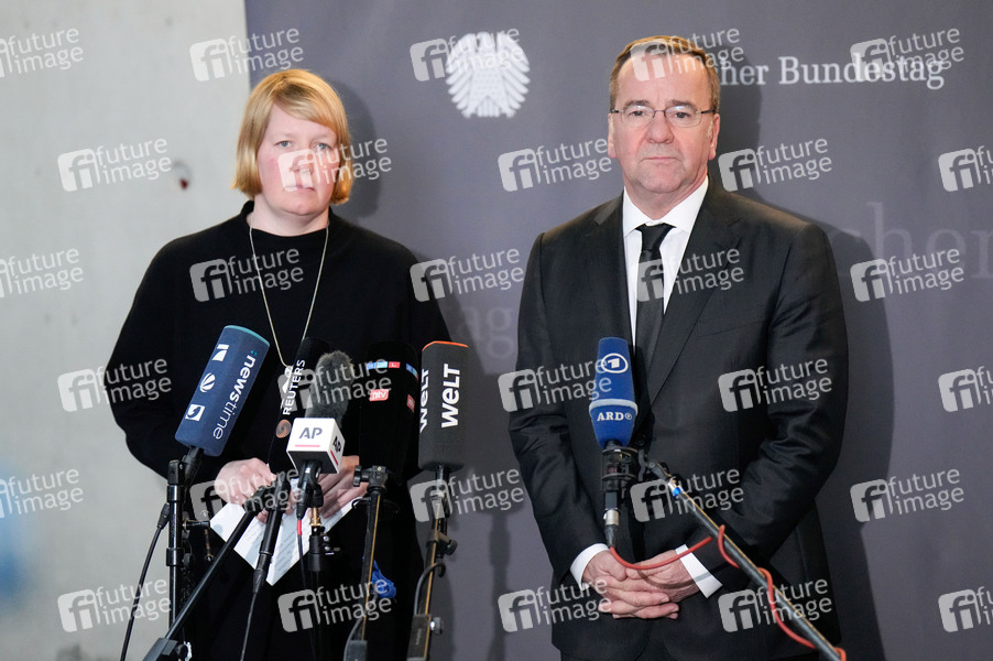 Wiebke Esdar und Boris Pistorius beim Pressestatement im Vorfeld der 5. Sitzung Gremium Sondervermögen Bundeswehr im Reichstagsgebäude. Berlin, 20.03.2024