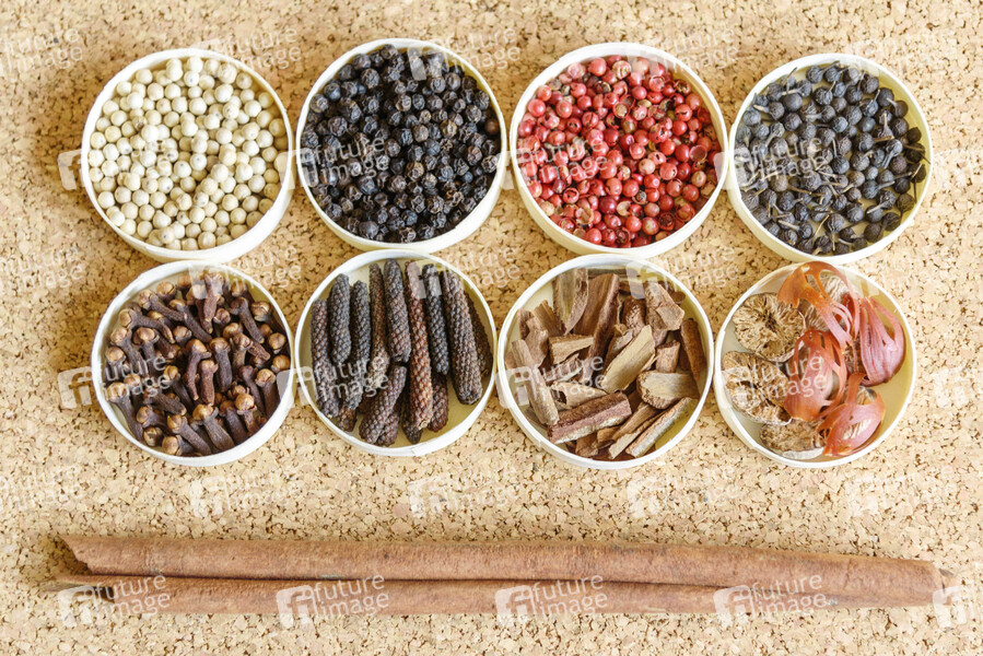 Gewürze, Gewürz, Kochen, Küche, Muskat, Muskatblüte, Zimt, Zimtkassie, Vanille, Nelken, Nelke, schwarzer Pfeffer, weißer Pfeffer, Kubeben Pfeffer, langer Pfeffer, Pfefferkörner, Piper Nigrum, Aroma, aromatisch, Gastronomie, Indonesien, Organic, Pfeffer, Spices, Sulawesi, Symbolbild, Symbolfoto