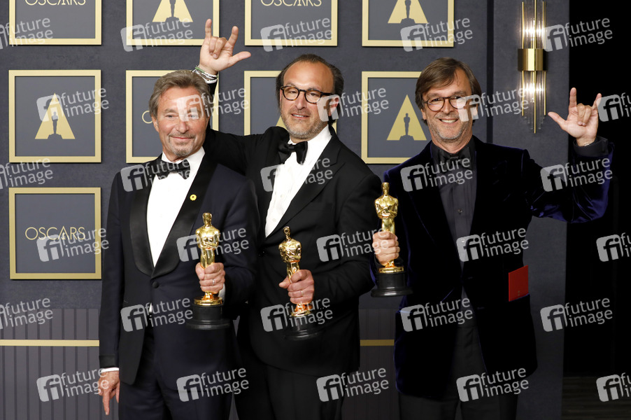 Patrick Wachsberger, Fabrice Gianfermi und Philippe Rousselet mit dem Oscar für den besten Film 'Coda' im Press Room der Oscar Verleihung 2022 / 94th Annual Academy Awards im Hollywood & Highland Center. Los Angeles, 27.03.2022