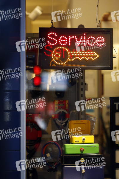 Eine Leuchtreklame für Schlüsseldienst Service an einem Fachgeschäft für Schlösser, Türen und Türschlösser. (Themenbild, Symbolbild) Köln, 12.04.2021