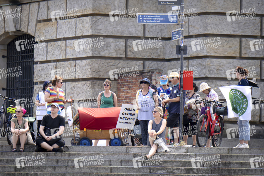 'Omas gegen Rechts' versuchen das Interview Alice Weidel zu stören beim ARD-Sommerinterview auf der Terrasse vom Marie-Elisabeth-Lüders-Haus. Berlin, 20.07.2025