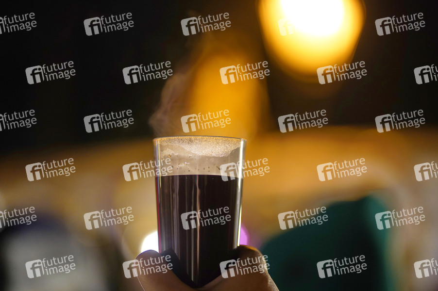 Heißer Kakao im Mehrwegbecher - Der Alt-Rixdorfer Weihnachtsmarkt am Richardplatz im Berliner Bezirk Neukölln bietet eine besondere Atmosphäre: Nur karitative und gemeinnützige Organisationen präsentieren ihre Waren im besonderen Ambiente des warmen Lichts aus Öllampen in der historischen Kulisse des alten Dorfes Rixdorf im 48. Jahr. Berlin, 02.12.2022