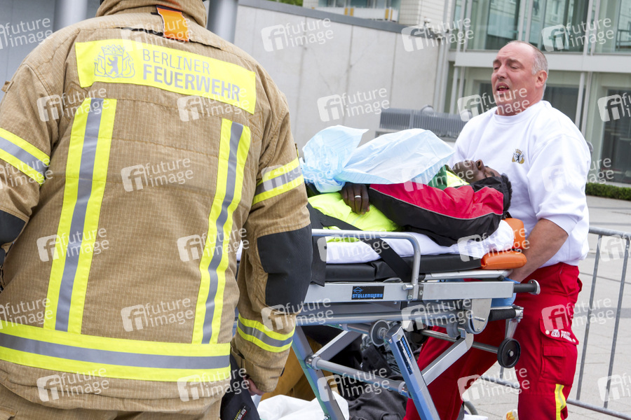Ein Refugee wird von Sanitätern der Berliner Feuerwehr mit einem Rettungswagen ins Krankenhaus gebracht. Am Berlin Congress Center (bcc) befinden sich Flüchtlinge seit 6 Tagen im Hungerstreik. Sie fordern den Stopp aller Abschiebungen, dauerhafte Anerkennung des Aufenthaltes und die Aufhebung der Dublin-Verträge. Berlin, 08.05.2014