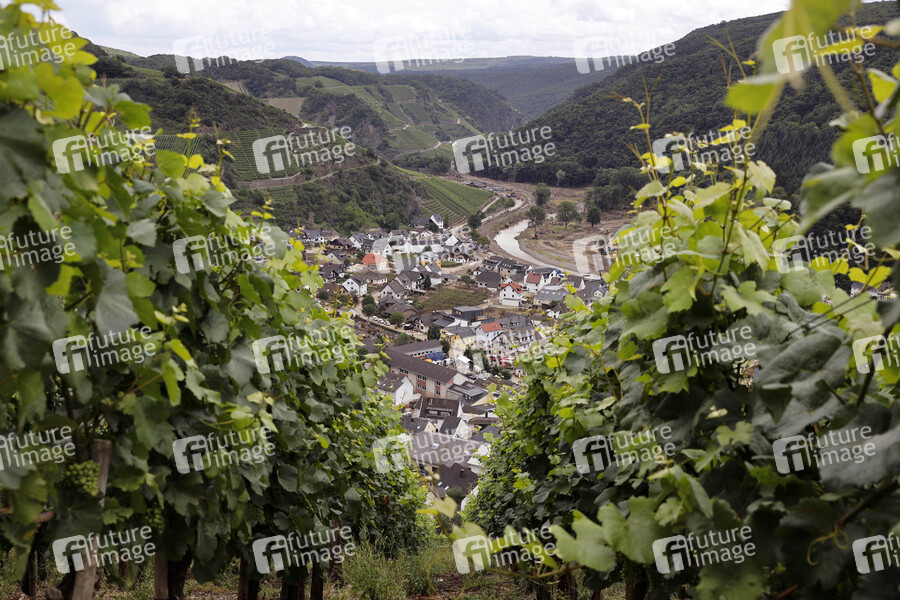 Nach dem Jahrhunderthochwasser in der Eifel durch heftige Regenfälle und Dauerregen mit Überschwemmungen und Überflutungen haben die Aufräumarbeiten im Ahrtal große Fortschritte gemacht. Einheiten von Polizei, THW, Bundeswehr und Feuerwehr mitsamt vielen freiwilligen Helfern haben Straßen geräumt, Schutt und Schlamm entfernt und die Menschen versorgt. Der Wiederaufbau wird trotzdem Jahre dauern. Im Bild Flutschäden in der Ortschaft Dernau, in der die Flut viele Häuser zerstörte, 08.08.2021