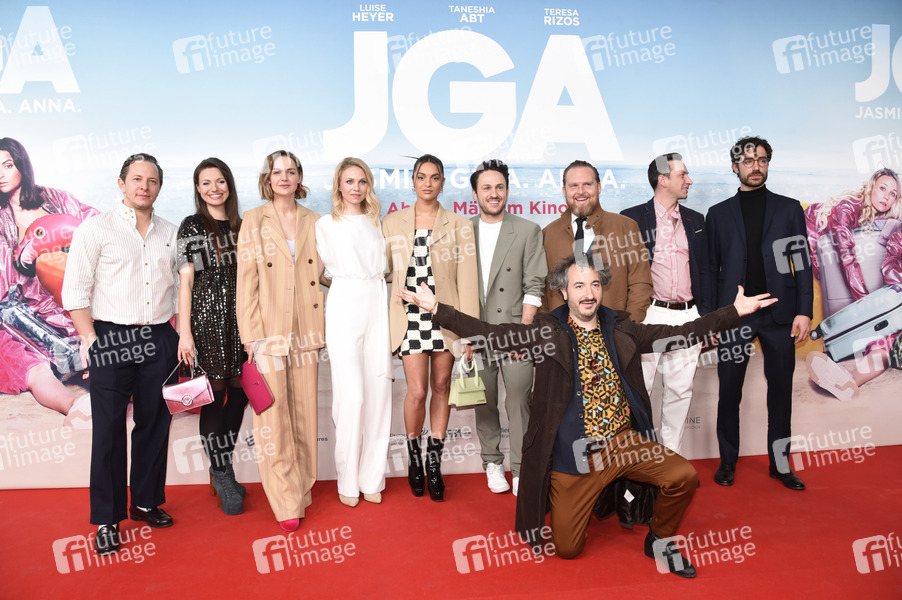 Trystan Pütter, Julia Hartmann, Luise Heyer, Teresa Rizos, Taneshia Abt, Dimitrij Schaad, Josep Riera, Axel Stein, Arnel Taci und Hassan Akkouch bei der Premiere des Kinofilms 'JGA: Jasmin. Gina. Anna.' im Mathäser Filmpalast. München, 09.03.2022