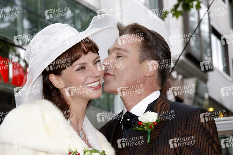 Das Brautpaar Jacques Breuer und Viola Wedekind mit der Hochzeitskutsche unterwegs vom Theater am Kurfürstendamm zur Hochzeitsfeier im Hotel Seehof