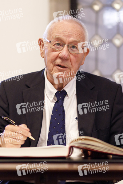 Armin Maiwald beim Eintrag ins Gästebuch - Oberbürgermeisterin Henriette Reker ehrt den Vater der 'Sendung mit der Maus' zu seinem 80. Geburtstag im historischen Rathaus. Köln, 13.08.2020