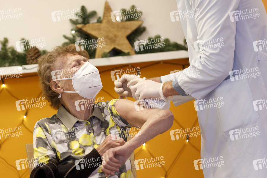 Heimbewohner beim Impfbeginn in Köln. Zum Impfstart in Köln werden Senioren und Mitarbeiter der Kölner Sozialbetriebe mit dem Corona-Impfstoff von Biontech Pfizer geimpft. Als erste Kölnerin erhielt die 92-jährige Gertrud Vogel, eine Pflegeheimbewohnerin des Seniorenzentrum Riehl das Vakzin. Köln, 27.12.2020