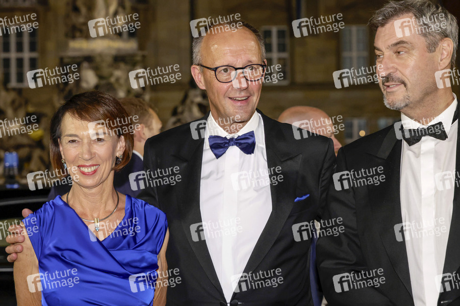 Friedrich Merz mit Ehefrau Charlotte Merz und Markus Söder beim Staatsempfang nach der Eröffnung der 113. Richard-Wagner-Festspiele 2025 mit der Neuinszenierung von 'Die Meistersinger von Nürnberg' im Neuen Schloss Bayreuth. Bayreuth, 25.07.2025