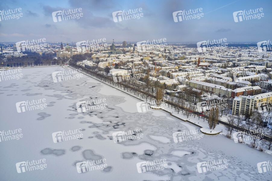 Luftbild vom zugefrorenen Maschsee und der Südstadt im Winter. (Der Drohnenflug wurde ordnungsgemäß bei der Polizei Leitstelle Hannover angemeldet) Hannover, 09.02.2021