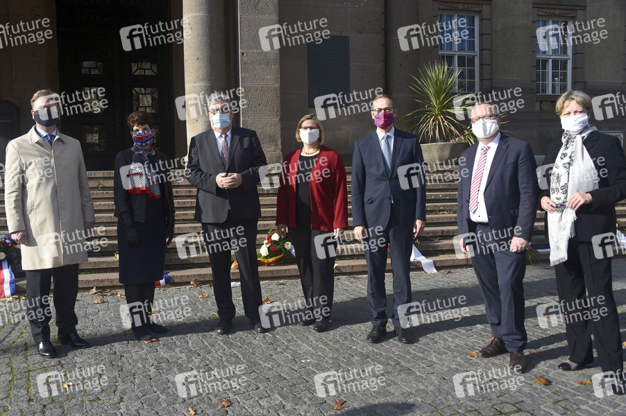 Jason Rhodes, Robin S. Quinville, Stefan Böltes, Angelika Schöttler, Michael Müller, Ralf Wieland und Sylvie Massiere beim Gedenkmoment zum 12 Uhr-Glockenschlag der Freiheitsglocke im Turm des Schöneberger Rathauses mit Gebindeniederlegung aus Anlass des 70-jährigen Jubiläums des ersten Glockenschlags vor dem Rathaus Schöneberg. Berlin, 24.10.2020