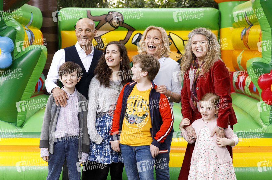 Bruno Grüner, Heiner Lauterbach, Maya Lauterbach, Julius Weckauf, Maren Kroymann, Barbara Sukowa und Luise Gleich beim Fototermin am Set des Kinofilms 'Enkel für Anfänger' am Dellbrücker Mauspfad. Köln, 30.04.2019