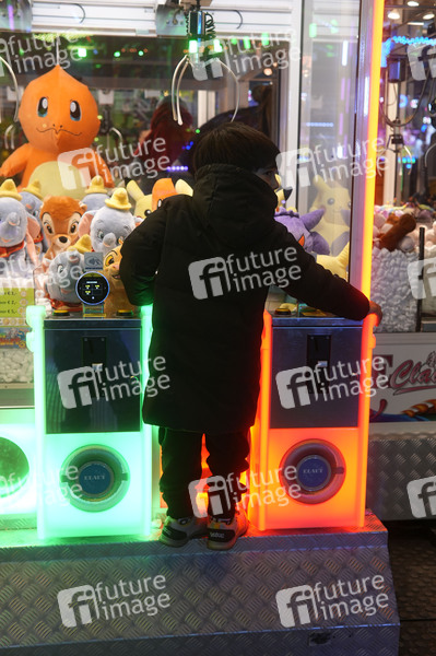 Greifarm Automat mit Stofftieren auf dem Weihnachtsmarkt 'Lichtenberger Winterzeit' an der Landsberger Allee im Berliner Bezirk Lichtenberg. Berlin, 03.11.2024
