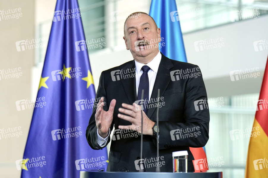 Ilham Alijew beim Empfang des Präsidenten von Aserbaidschan zu einem Gespräch mit dem Bundeskanzler mit anschließendem Pressestatement im Bundeskanzleramt. Berlin, 26.04.2024