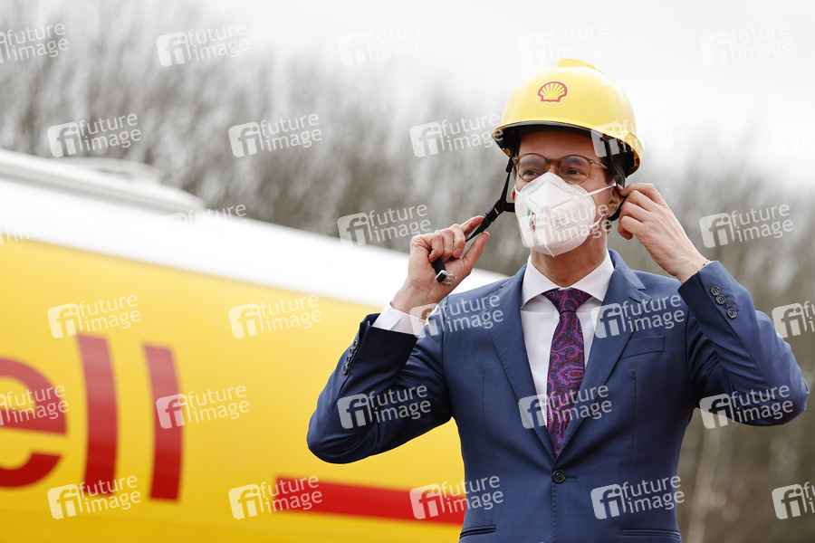 NRW-Ministerpräsident Hendrik Wüst bei der Eröffnung der Baustelle für Deutschlands größte Anlage zur Herstellung von Bio-Flüssiggas auf dem Gelände des 'Shell Energy an Chemicals Park Rheinland'. Köln, 09.02.2022