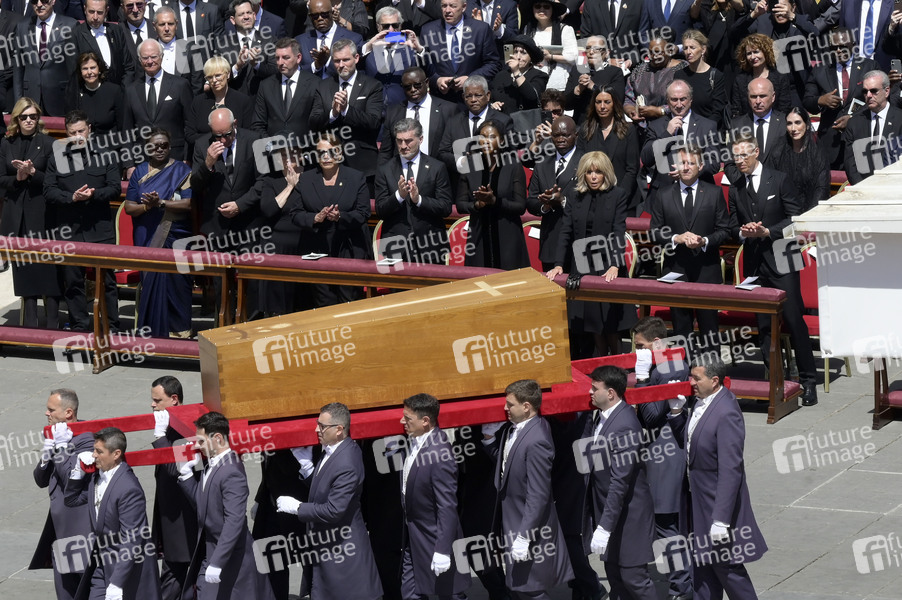 Der Sarg bei der Trauermesse für den verstorbenen Papst Franziskus auf dem Petersplatz. Vatikanstadt, 26.04.2025