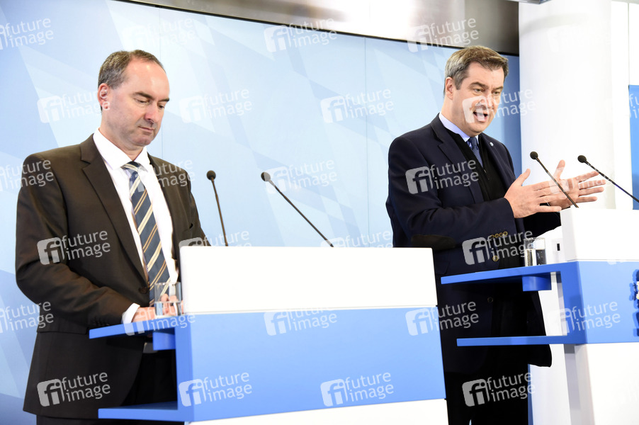 Hubert Aiwanger und Markus Söder bei der Pressekonferenz zur Kabinettssitzung zum Thema Coronavirus-Infektion und die Auswirkungen auf die bayerische Wirtschaft in der Staatskanzlei. München, 10.03.2020