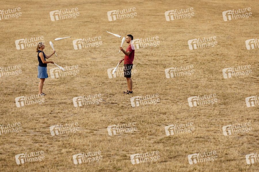 Jongleure auf einer verdorrten Wiese im Rheinpark. Köln, 25.07.2019