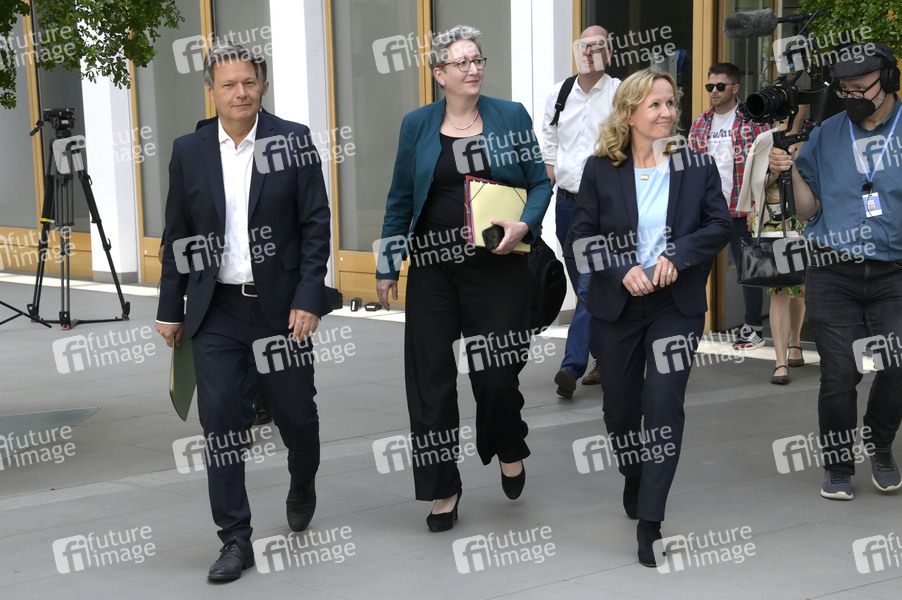 Robert Habeck, Klara Geywitz und Steffi Lemke bei der Bundespressekonferenz zu den Gesetzesentwürfen aus dem heutigen Kabinett zu Wind-an-Land und Bundesnaturschutzgesetz im Haus der Bundespressekonferenz. Berlin, 15.06.2022