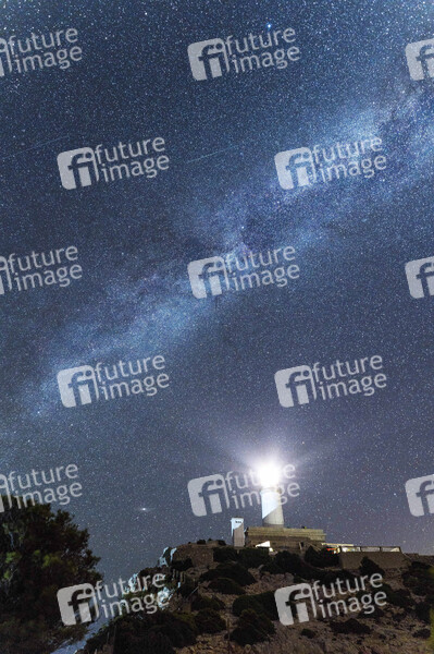 Die Milchstraße über dem Cap Formentor. Das Milchstraßensystem besteht aus etwa 100 bis 300 Milliarden Sternen und großen Mengen interstellarer und Dunkler Materie. Mallorca, 20.07.2020