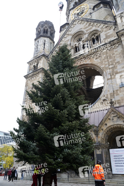 Aufstellung einer 17 Meter hohen Nordmanntanne für den Weihnachtsmarkt auf dem Breitscheidplatz vor der Kaiser-Wilhelm-Gedächtnis-Kirche. Berlin, 02.11.2021