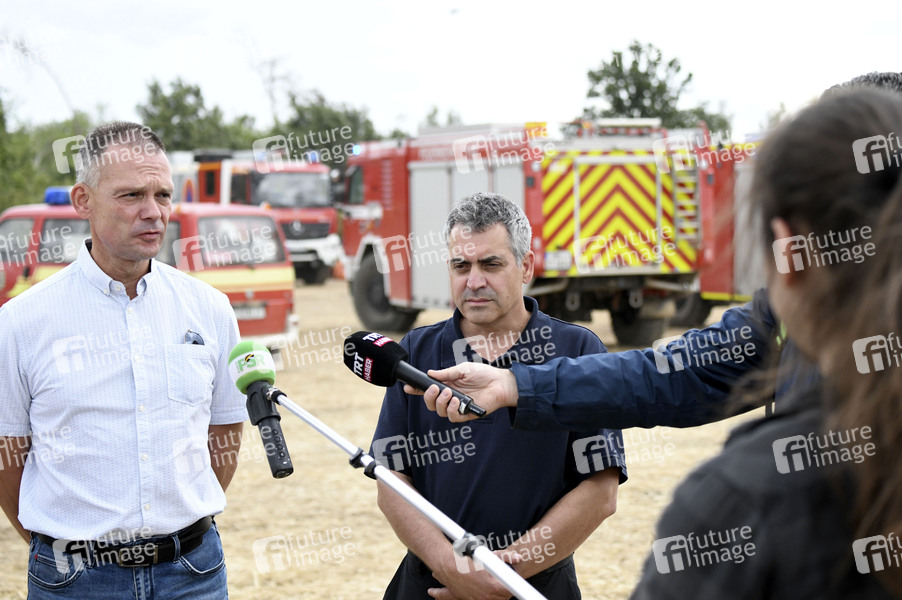 Landrat Ralf Hänsel und Kreisbrandmeister Thomas Fischer beim Pressetermin in der Gohrischheide, wo es seit dem 1. Juli brennt. Derzeit wird von einer vom Brand betroffenen Fläche von etwa 2.100 Hektar ausgegangen. Aktuell befinden sich etwa 600 Kräfte von der Freiwilligen Feuerwehr, dem Technischen Hilfswerk, der Bundeswehr, der Polizei und anderen Organisationen in den fünf Einsatzabschnitten im Einsatz. Im Einsatzabschnitt Jacobsthal ist die Lage stabil. Es gilt weiterhin eine Ausbreitung des Brandgeschehens Richtung Süden zu verhindern sowie den alten Sprengplatz und die Ortschaft zu schützen. Jacobsthal, 07.07.2025