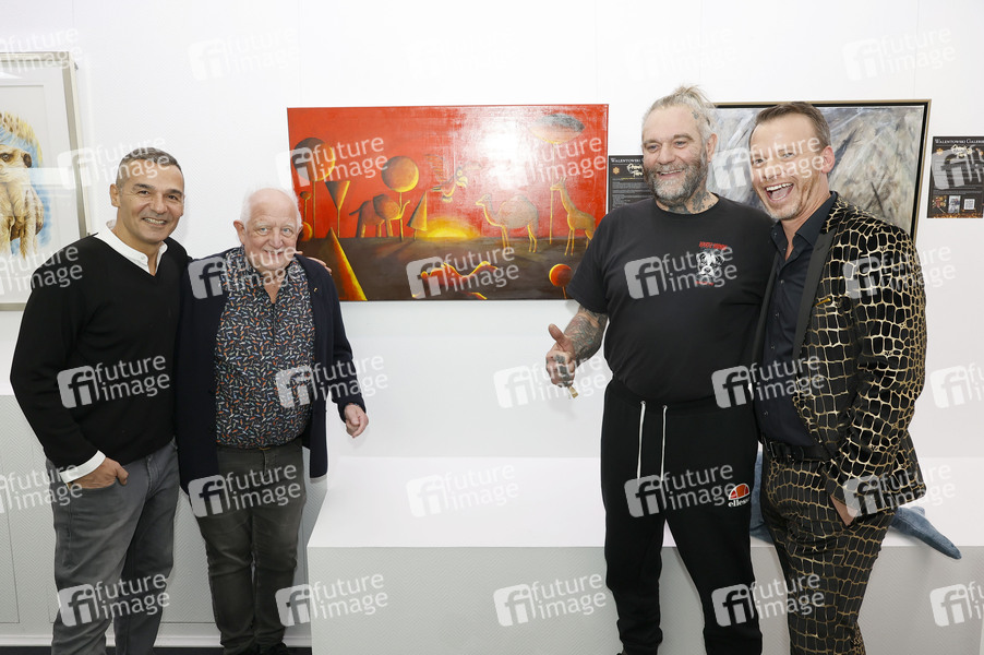 Erol Sander, Wolfgang Leibhold, Ralf Seeger undChristian Ehrlich beim Start der zweiten Kunst-Aktion 'Art'n'Schutz' zugunsten des Tier- und Artenschutzes mit einer Vernissage mit Bildern bedrohter Tiere gemalt von Promis in der Galerie Walentowski. Werl, 23.11.2024