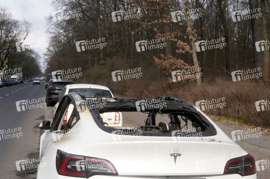 Brand, Feuer, Auto, PKW, Autowrack, Autowracks, Brandstiftung, Fahrzeug, Umweltverschmutzung, Symbolfoto, Symbolbild, Themenfoto, Symbolfoto, Autobrand, Protest gegen Elon Musk