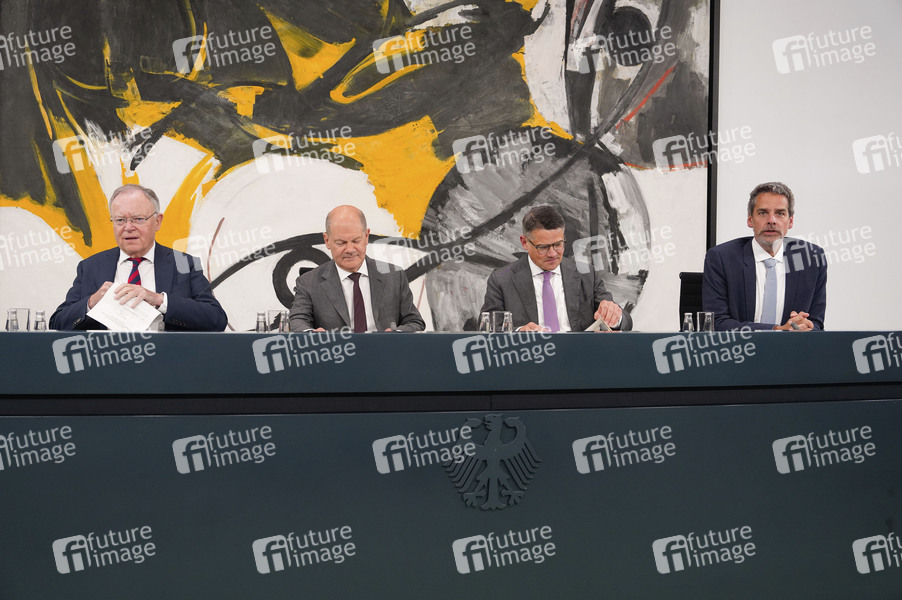 Stephan Weil, Olaf Scholz, Boris Rhein und Steffen Hebestreit bei der Pressekonferenz im Anschluss an die Beratungen der Bundesregierung mit den Regierungschefinnen und Regierungschefs der Länder im Bundeskanzleramt. Berlin, 20.06.2024