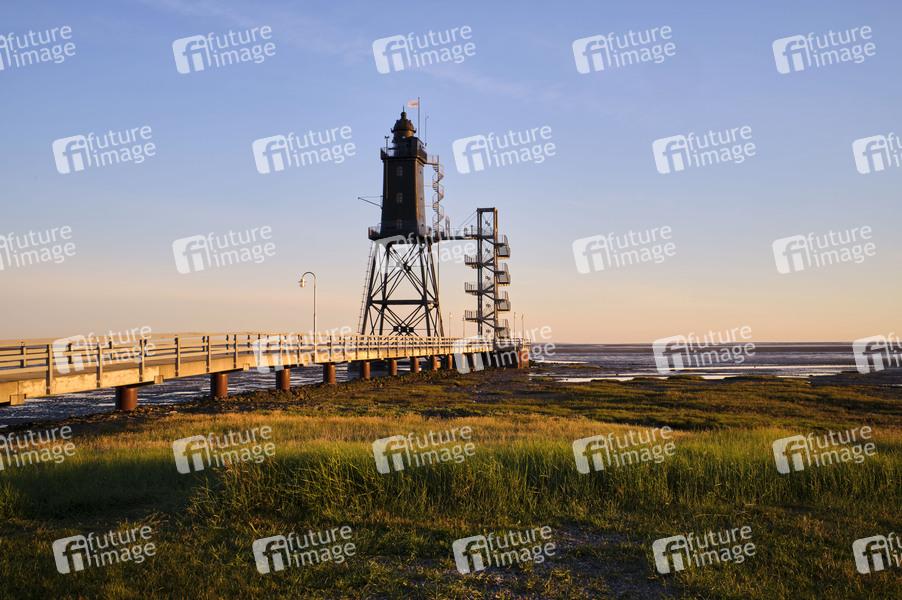 Eversand-Oberfeuer, Turm, Höhe 37.4 m, Gitterkonstruktion, runde Laterne, Sedhenswürdigkeit, Befeuerung, Schifffahrtszeichen, Positionsbestimmung, Abendstimmung