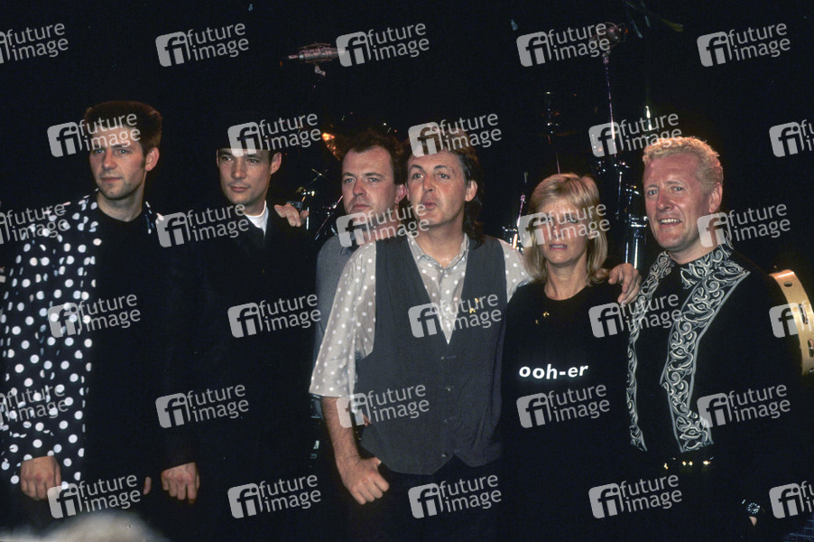 Chris Whitten (Drums), Paul Wickens (Keyboards), Robbie McIntosh (Gitarre), Paul McCartney (Bass, Gitarre, Gesang), Linda McCartney (Keyboards) und Hamish Stuart (Gitarre, Bass) beim Pressetermin mit Showcase zur Paul McCartney World Tour 1989/90 im Playhouse Theatre. London, 27.07.1989
