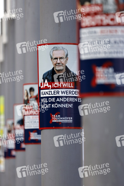 Wahlplakate der Partei Team Todenhöfer mit dem Konterfei von Jürgen Todenhöfer. Zuletzt warb der Fußballer Mesut Özil für die Partei des ehemaligen CDU-Politikers. Köln, 18.09.2021