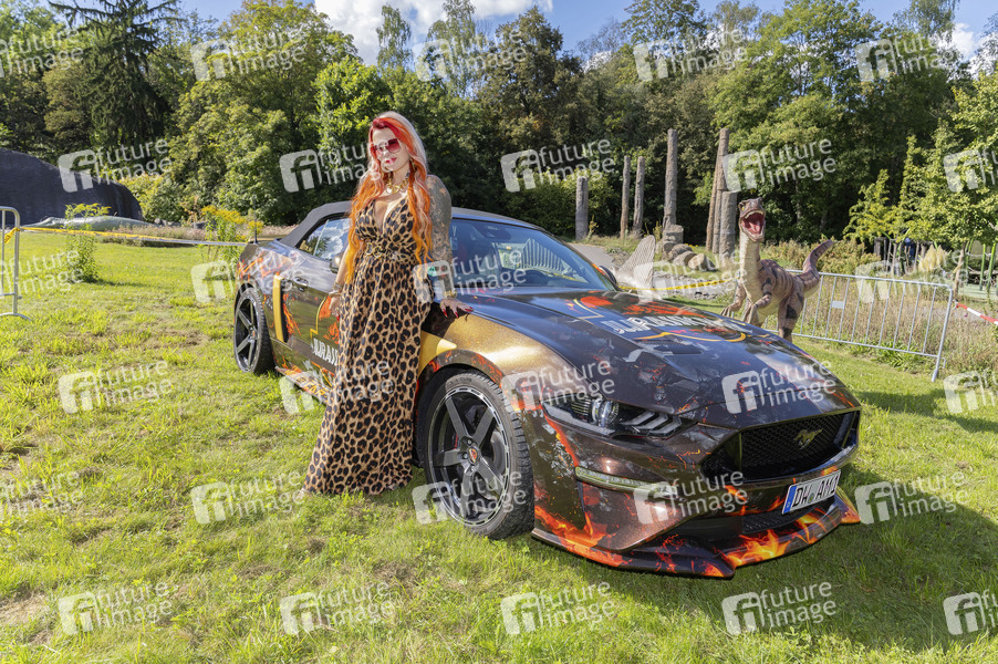 Lyn Künstner und ihr Ford Mustang bei den Jurassic Days im Saurierpark Kleinwelka. Lyn Künstner aus Dresden ist Influencerin und Dino-Fan. Ihr Auto, ein Ford Mustang mit 450 PS, hat sie im Stil von Jurassic Park gestalten lassen. Auf den Seiten des Autos prangt das Logo der Abenteuerfilm-Reihe. Kleinwelka bei Bautzen, 07.09.2025
