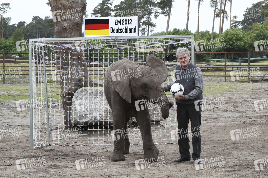 Start der Fan Fun Runde mit Elefantendame Nelly im Serengeti-Park, Hodenhagen. Gemeinsam mit Sepp Maier tippte Sie heute für das erste Spiel der deutschen Fußballnationalmannschaft gegen Portugal